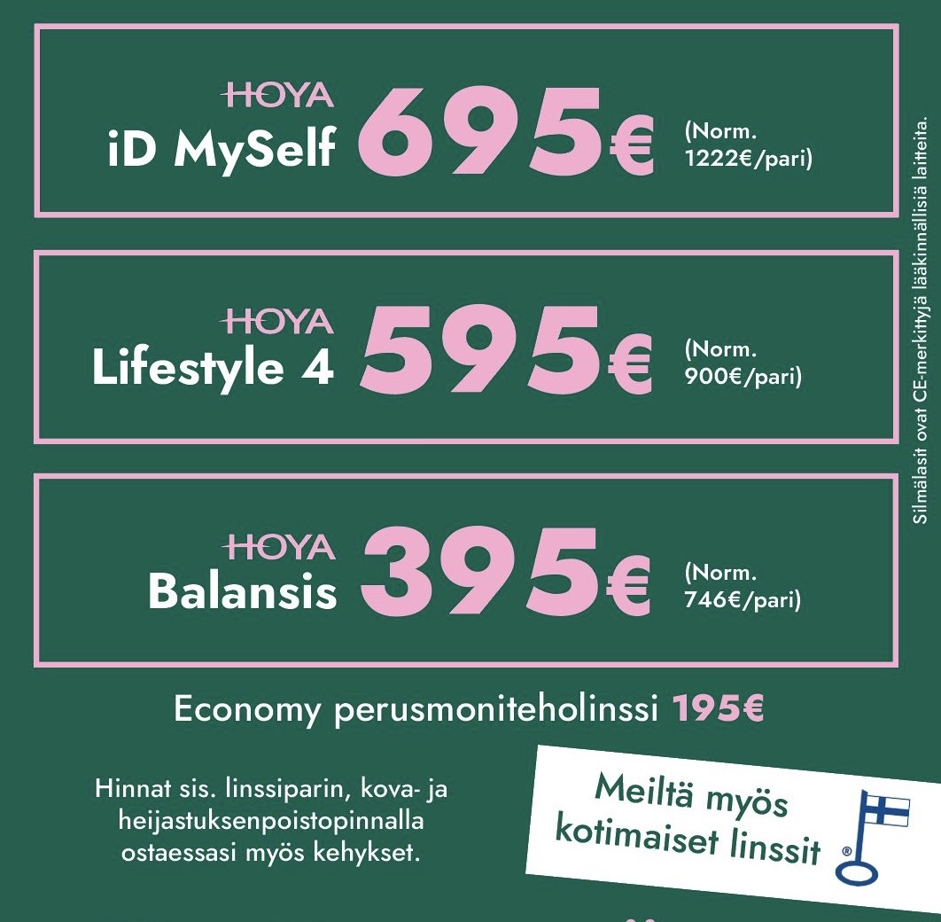 Tarjous on voimassa 31.12.2025 asti, ostaessasi myös kehykset. Ei koske Miyosmart, Ekonomi-linssejä tai lähilinssi-pakettihintoja. Tarjouksia ei voi yhdistää.